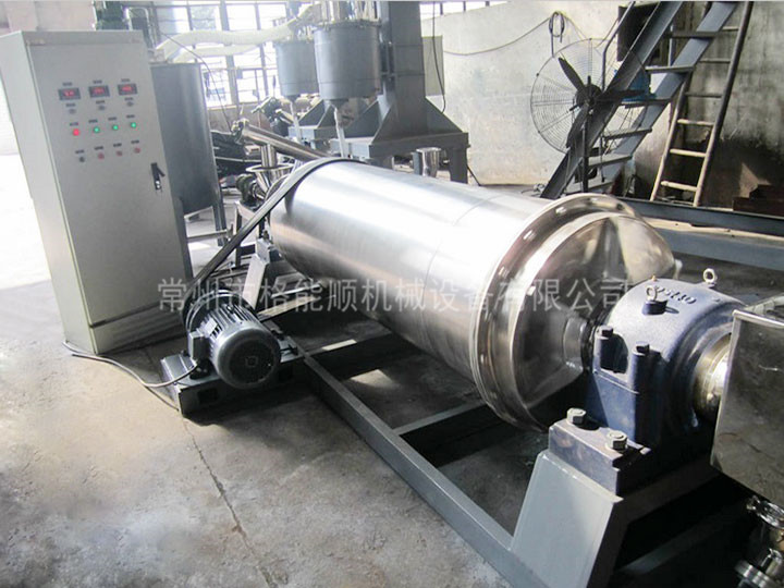 本機(jī)為臥式筒形旋轉(zhuǎn)裝置,外沿齒輪、鏈輪或皮帶傳動(dòng),兩倉格子型球麻機(jī)。