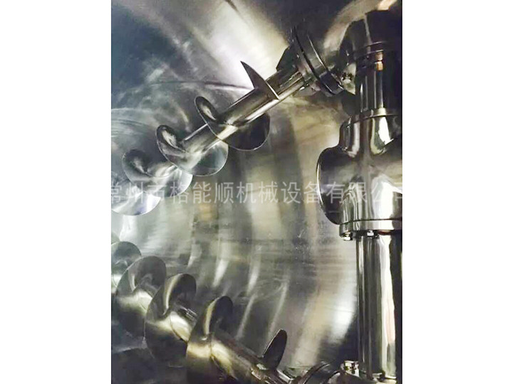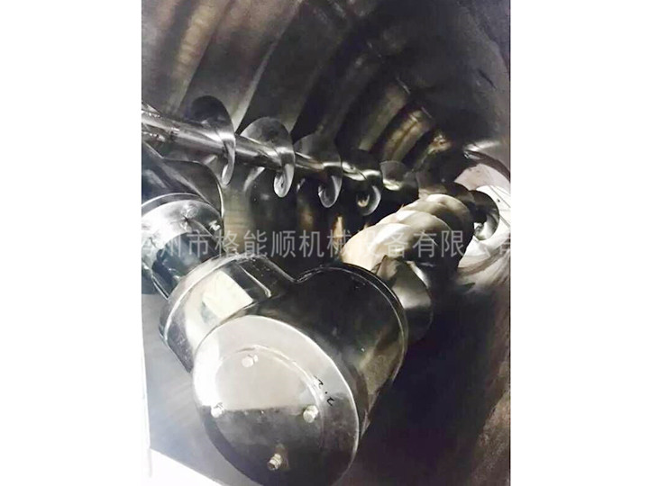 3、螺旋部分:筒體內(nèi)兩只非對稱排列的螺旋作自、公轉(zhuǎn)行星運(yùn)動時,在較大范圍翻動物料,使物料快速達(dá)到均勻混合。